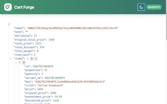 Cart Forge هو ملحق Chrome مصمم لمطوري ومتاجر Shopify، يوفر محرر بصري قوي لإدارة بيانات السلة. هذه الأداة المجانية تسمح للمستخدمين بفحص وتحرير محتويات السلة دون الحاجة إلى نصوص معقدة أو استخدام وحدة التحكم في المتصفح. الواجهة سهلة الاستخدام، وتتميز بوضع مظلم وتظليل بناء الجملة، مما يعزز من قابلية القراءة وسهولة الاستخدام أثناء فحص السلة.